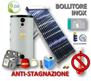 Kit Solare Termico a Circolazione Forzata per la produzione di Acqua Calda Sanitaria (ACS) equipaggiato con un collettore da 10 ed uno da 15 tubi sottovuoto tipo Heat-Pipe di diametro 58 mm e lunghezza 1800 mm dotati di speciale valvola anti-stagnazione (spegnimento automatico a circa 80°C), telaio universale regolabile (45°-15°) in alluminio con bulloneria INOX adatto sia a tetto piano che inclinato, piastra riflettente posteriore in Alluminio, Serbatoio di Accumulo INOX a doppio scambiatore da 300 litri con coibentazione esterna, Anodo in Magnesio, Valvola Automatica di Sfiato Aria, Stazione Solare a 2 Vie con Circolatore ad alta Efficienza Wilo Para ST 25/6 iPWM, misuratore di portata 1-6 l/min e Centralina Solare MTDC (2 relè + 3 sonde Pt1000) precablata e Vaso di Espansione Solare da 18 litri con staffa per montaggio a parete, flessibile inox da 0,5 m e doppia valvola di ritegno per smontaggio vaso pieno. Il collettore ha una superficie lorda complessiva di 5,39 m2 ed è dotato di certificato Solar Keymark presentando pertanto i requisiti per usufruire delle detrazioni fiscali IRPEF dedicate al Solare Termico oppure in alternativa accedere al Conto Termico